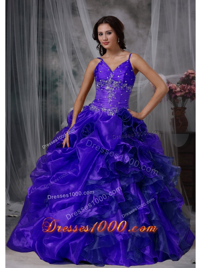 Purple Ball Gown Straps Beading Dress For Quinceanera with Ruffles and Hand Made Flowers