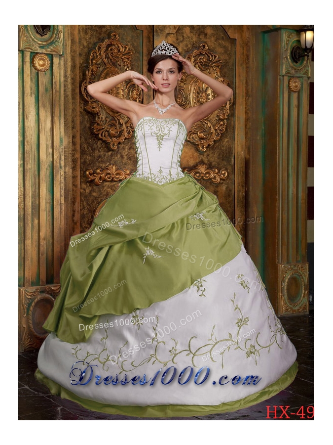 Olive Green Ball Gown Strapless Sweet 16 Dresses with Embroidery