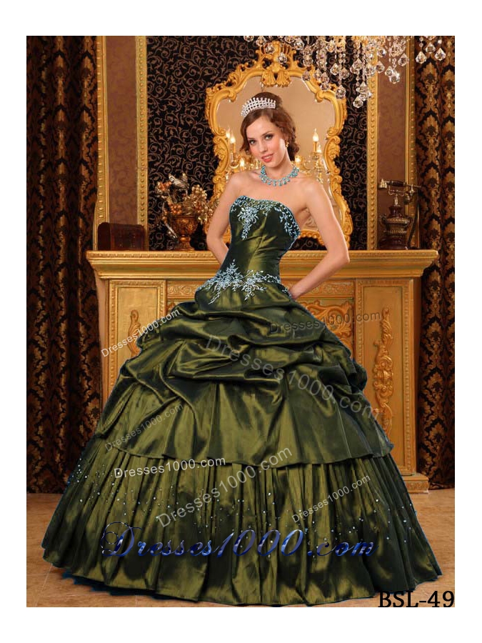 Remarkable Strapless Olive Green Sweet Sixteen Dresses with Pick-ups and Appliques
