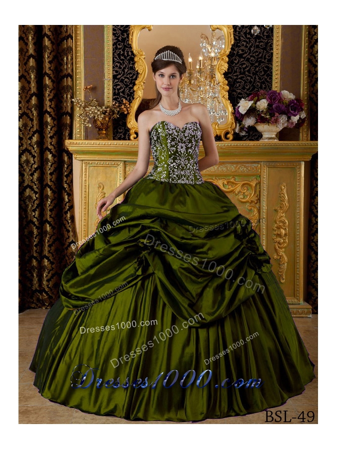Olive Green Sweetheart Sweet 16 Dresses with Pick-ups and Embroidery