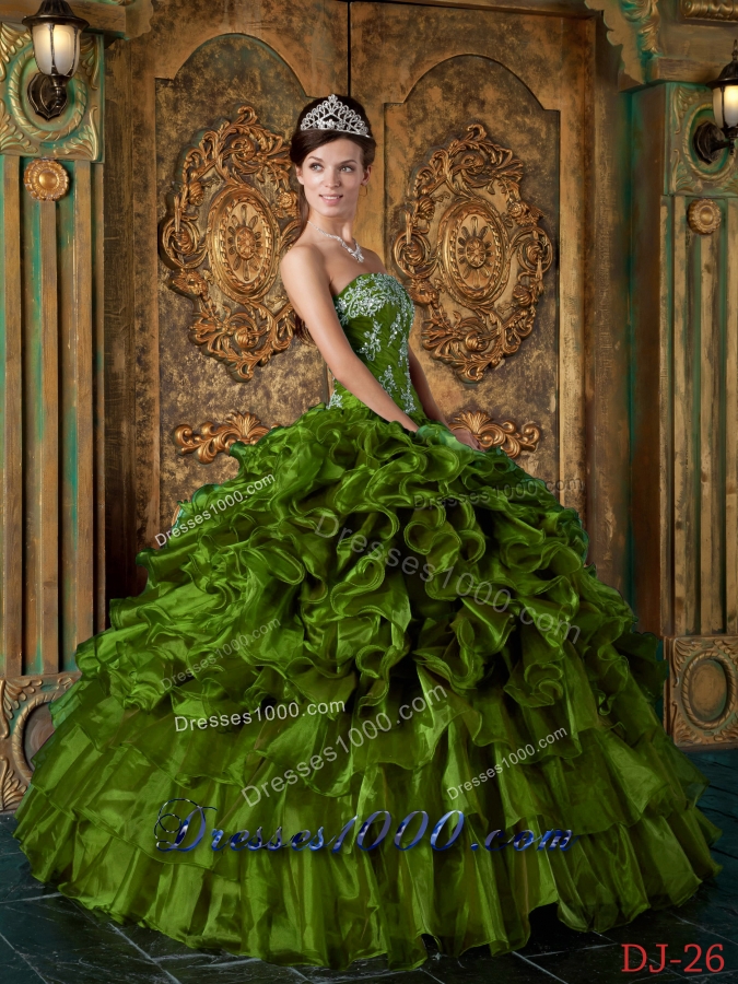 Olive Green Strapless Organza Sweet 16 Dresses with Appliques and Ruffles