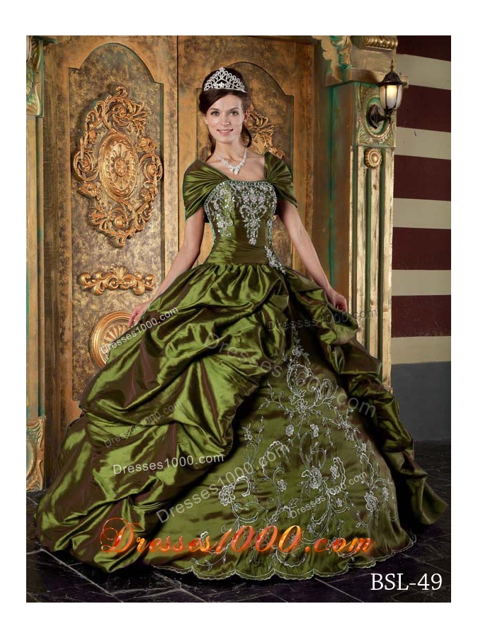 Olive Green Strapless Taffeta Embroidery Sweet Sixteen Dresses with Pick-ups