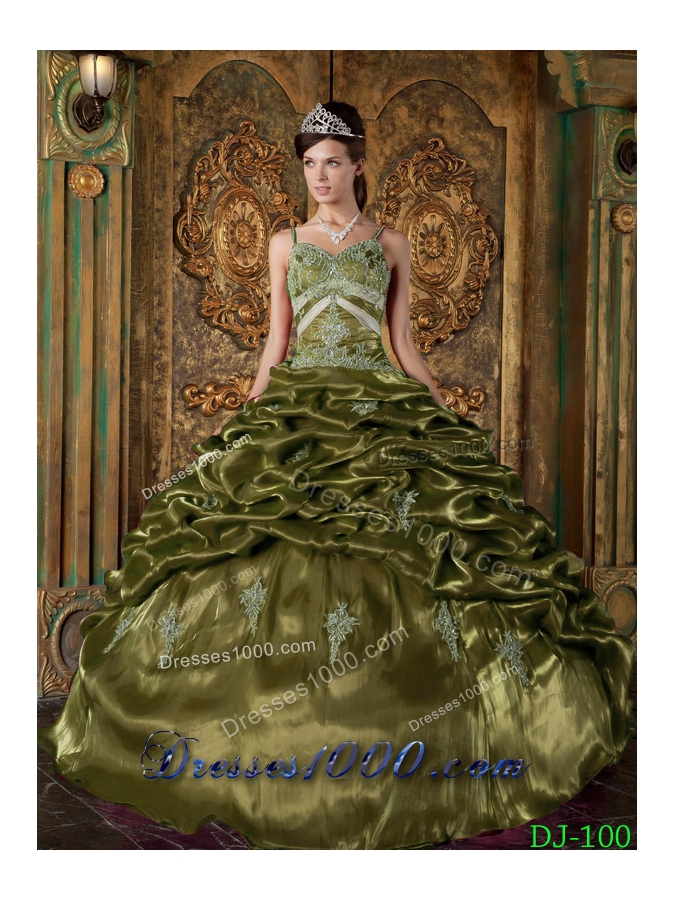 Olive Green Spaghetti Straps Taffeta Quinceaneras Dress with Pick-ups and Appliques