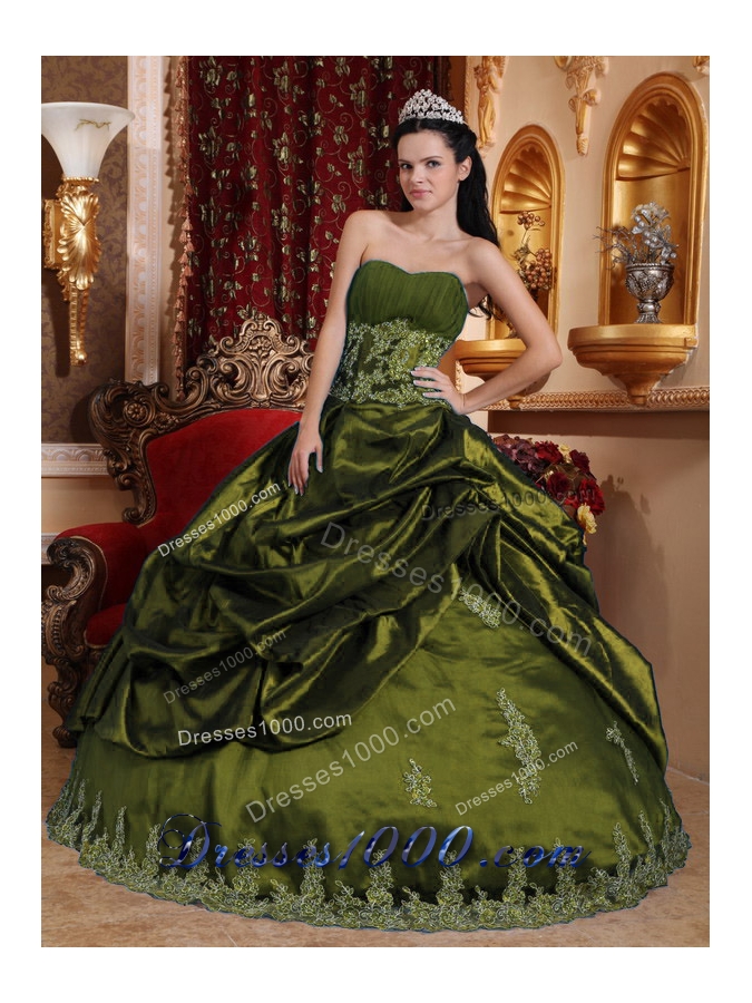 Olive Green Sweet 15 Dresses with Appliques and Pick-ups Sweetheart