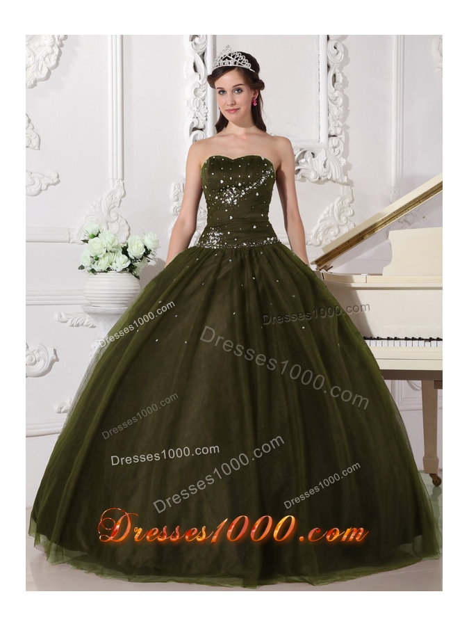 Ball Gown Sweetheart Tulle Olive Green Sweet 16 Dresses with Rhinestone