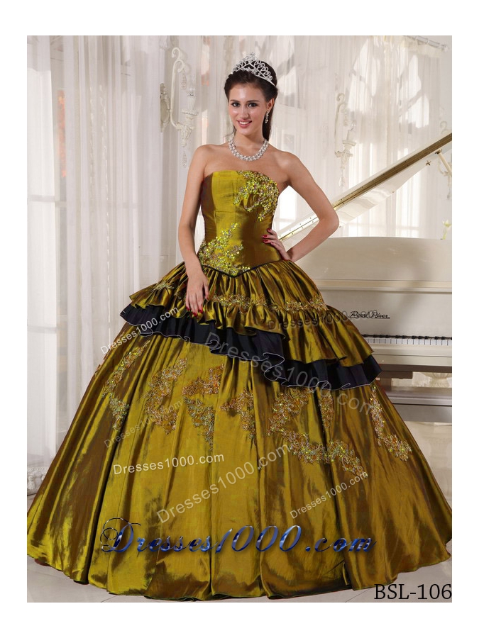 This beautiful straight neckline olive green quinceanera dress is featured with the small skirt covering the bottome of the dress. And the black tulle under the olive dress forms contrasting colors , which impinges your eyes easily. And the silver appliques with beading decorate the dress perfectly.