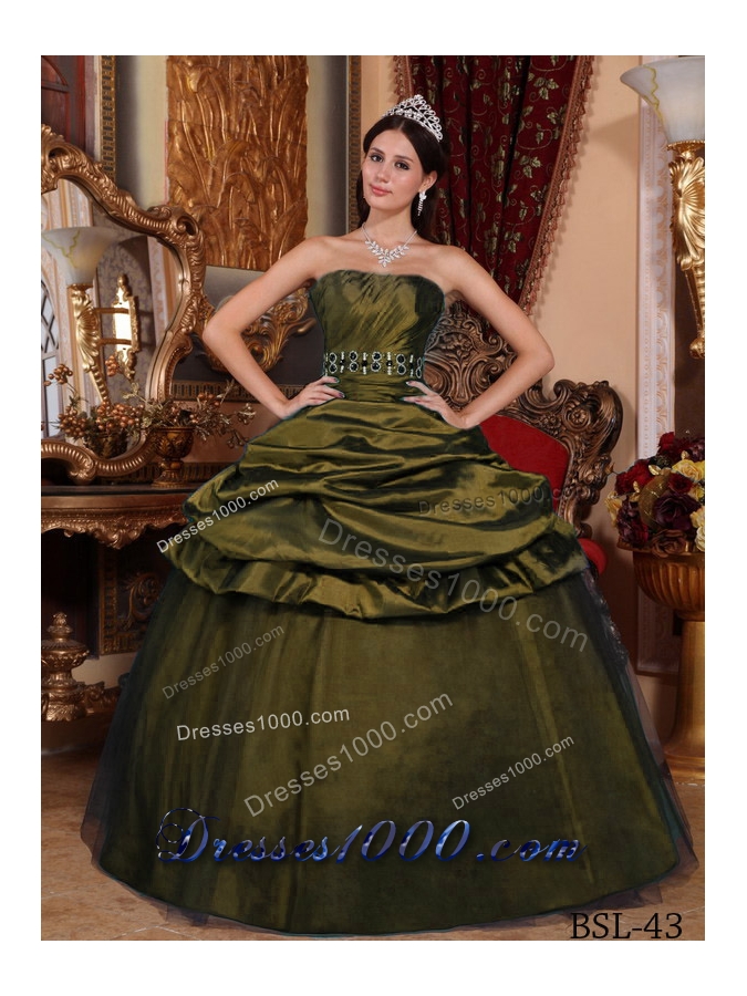 Olive Green Strapless Tulle and Taffeta Beading and Pick-ups Dresses For a Quince