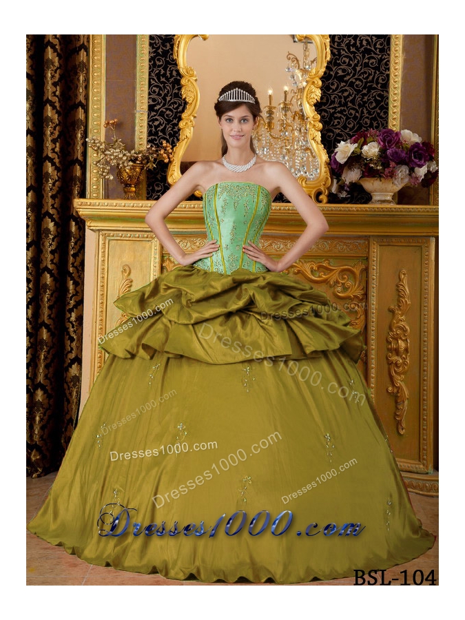 Olive Green Strapless Appliques Sweet 16 Dresses with Appliques and Pick-ups