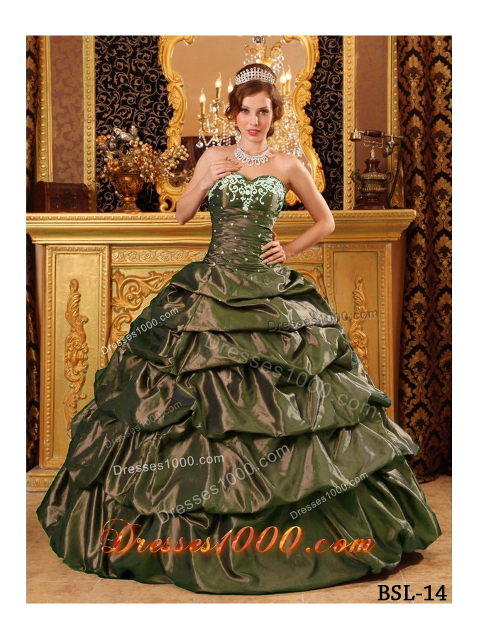 Fashionable Sweetheart Olive Green Sweet 16 Dresses with Appliques and Pick-ups
