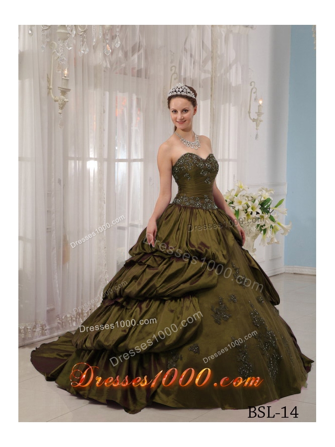 Olive Green Sweetheart Court Train Sweet 16 Dresses with Pick-ups and Appliques