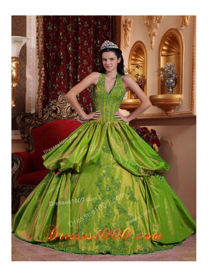 Olive Green Halter Appliques and Pick-ups Dress For Quinceaneras