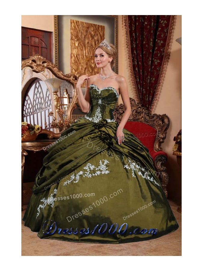 Olive Green Sweetheart Sweet 15 Dresses with Appliques and Pick-ups