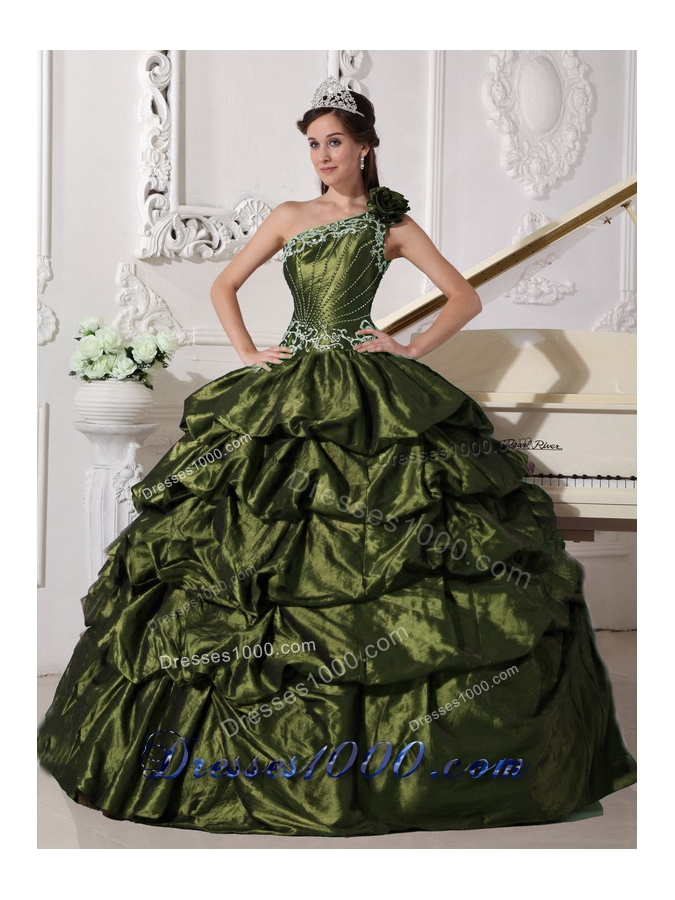 Olive Green Ball Gown One Shoulder Sweet 15 Dresses with Appliques and Pick-ups