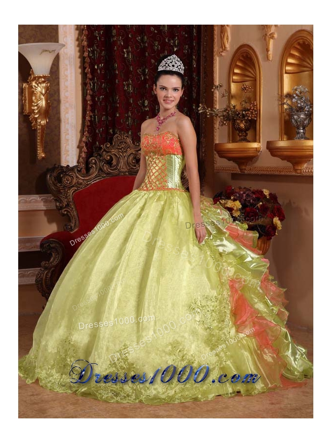 2014 Discount Yellow Green Puffy Strapless Embroidery Quinceanera Dress with Pick-ups