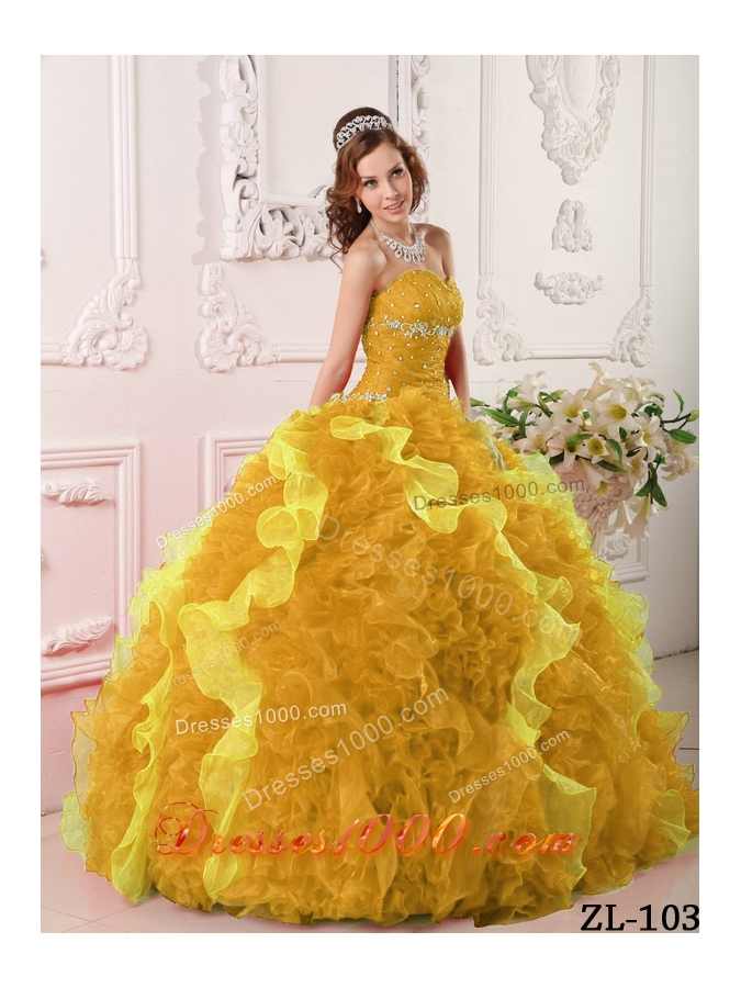 2014 Classical Gold Puffy Sweetheart Beading Quinceanera Dress with Appliques