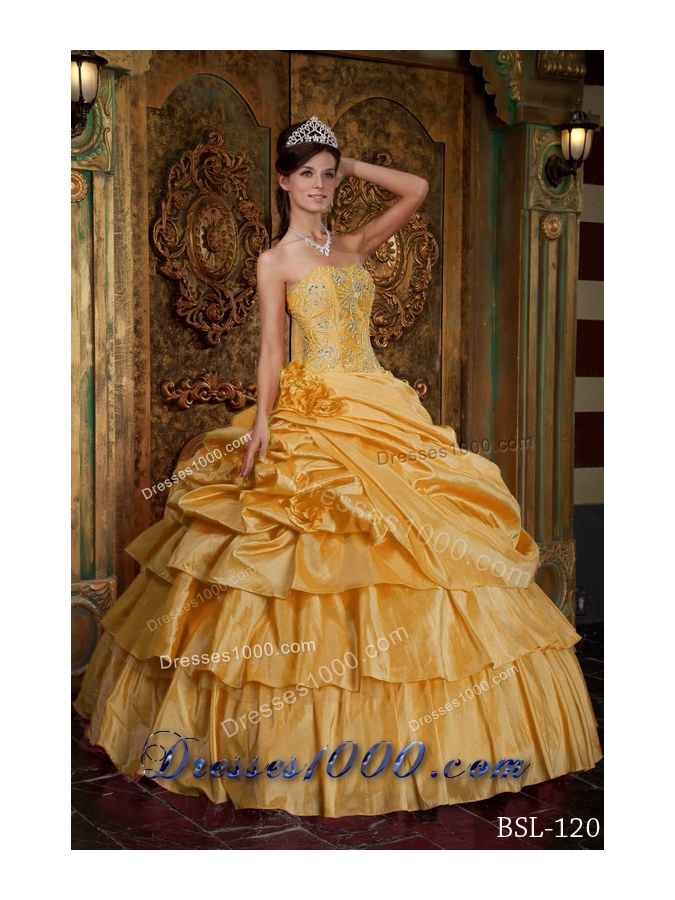 2014 Yellow Puffy Strapless Pick-ups Quinceanera Dress with Ruffled Layers