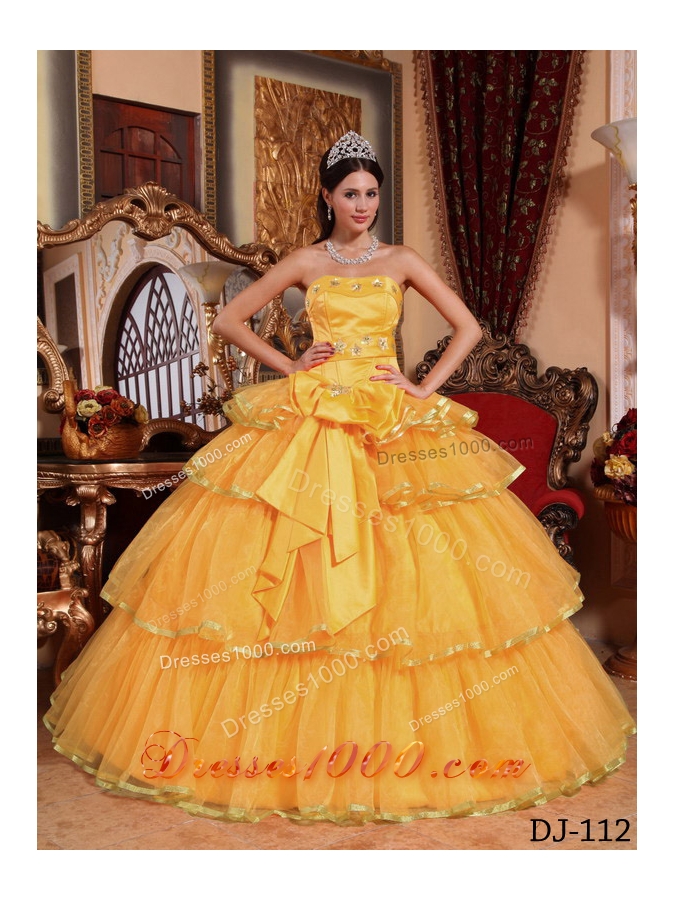 2014 Fashionable Golden Puffy Strapless Bow Quinceanera Dress with Ruffled Layers