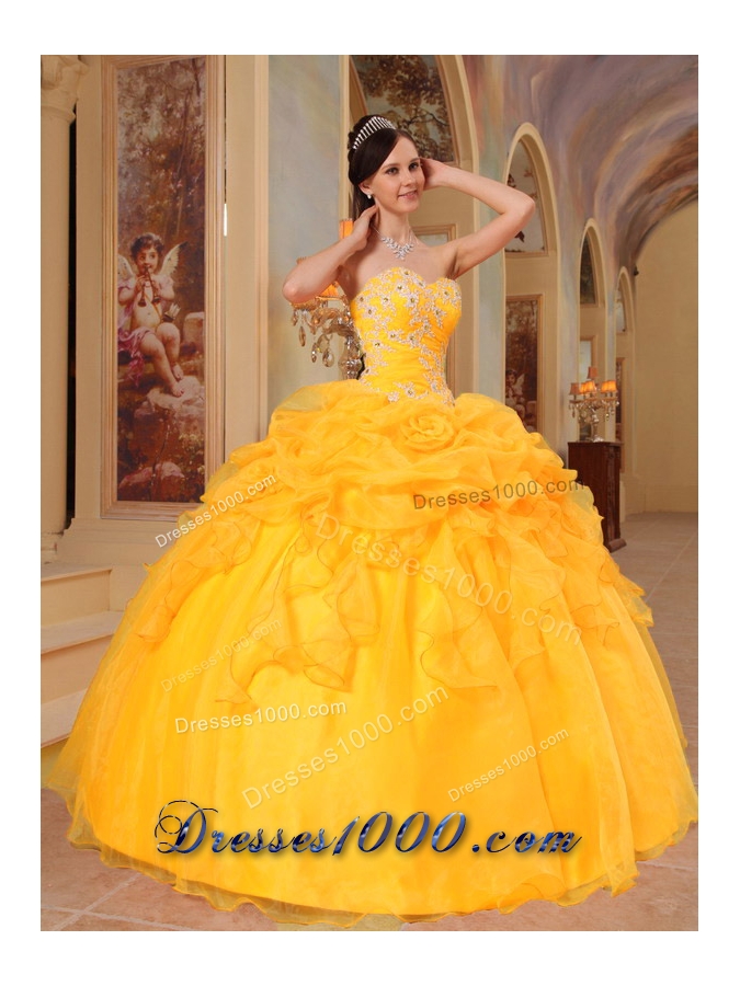 2014 Golden Puffy Sweetheart Appliques and Pick-ups Quinceanera Dress with Hand Made Flower