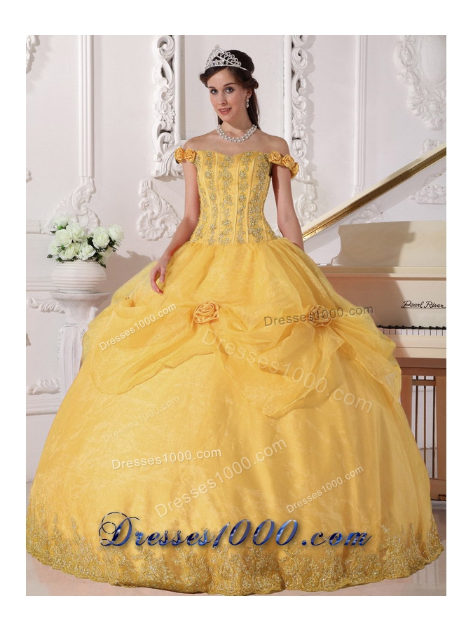 2014 Golden Off The Shoulder Appliques Quinceanera Dress with Hand Made Flowers