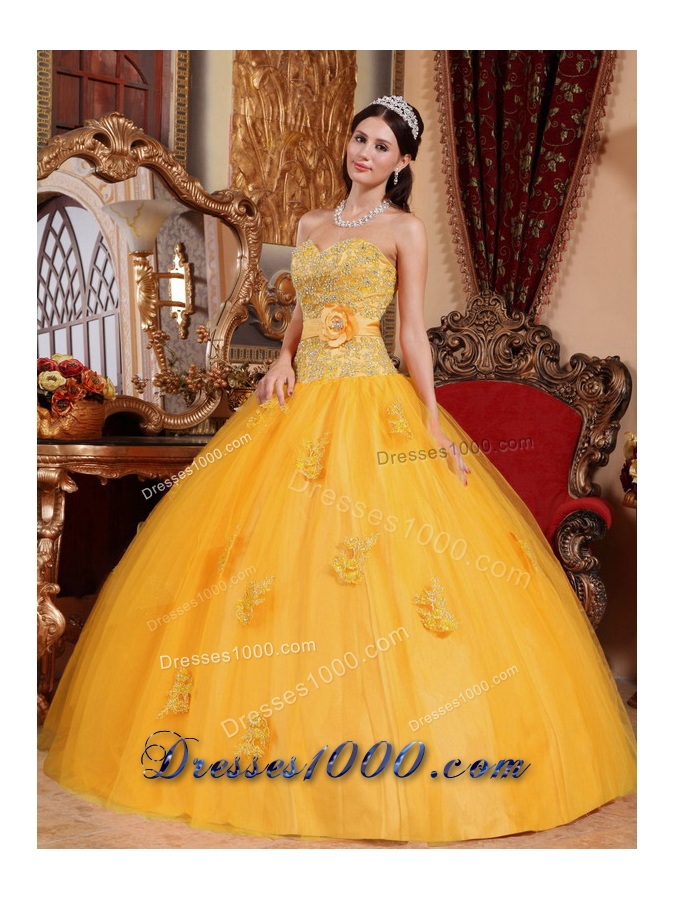 2014 Gold Puffy Sweetheart Appliques Quinceanera Dress with Hand Made Flower