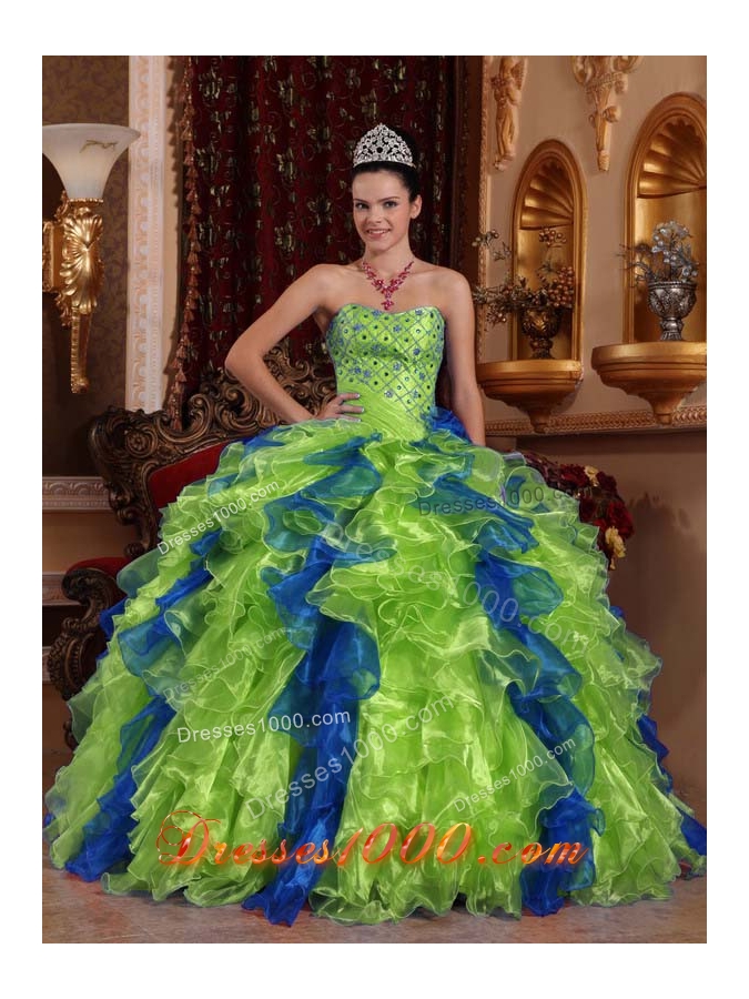 This colorful strapless sweetheart neckline quinceanera dress accented with many cute flowers and bead works throughout the bodice to creat a Grid lines.What's more,the asymmetrical pleated fabric on one side of the waist defines your unique taste. The fully ruffled skirt sways beautifully across the floor when you move, as if you're floating on air. A lace up corset style closure in the back secures the dress in place.