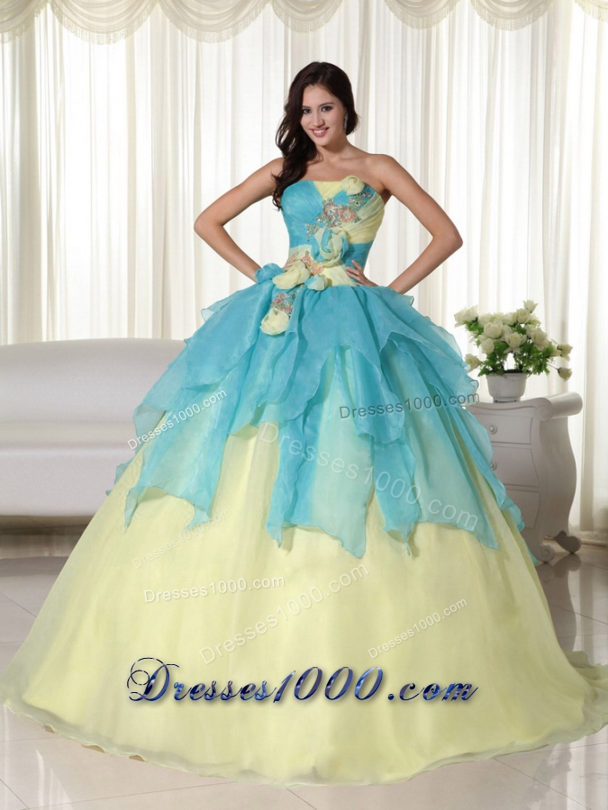 Your time in the spotlight will be even more amazing when you`re wearing this sophisticated Quinceanera strapless ball gown! Its floor-length skirt features a short, ruffled overlay that imbues it with classic panache. Overlapping swaths of finely pleated material fit closely on bust. The handmade flowers on the bodice adds more romance to the top. For the whole dress, the fabric in the contrasting colors will make you more shiny. A hidden zipper up back finishes the gorgeous design.