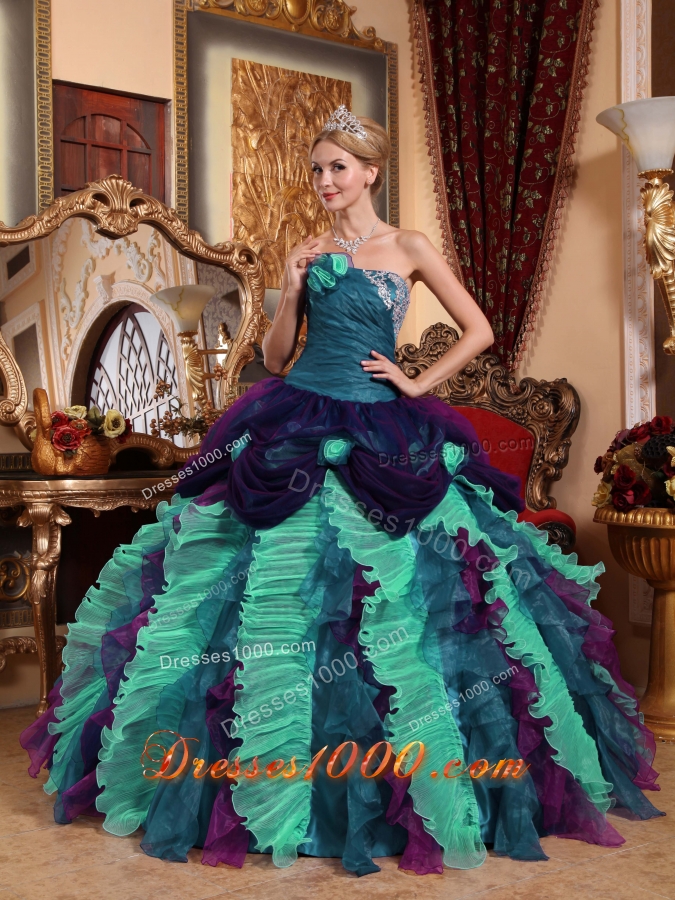 Multi-color Puffy Strapless Appliques and Beading Quinceanera Gowns for 2014