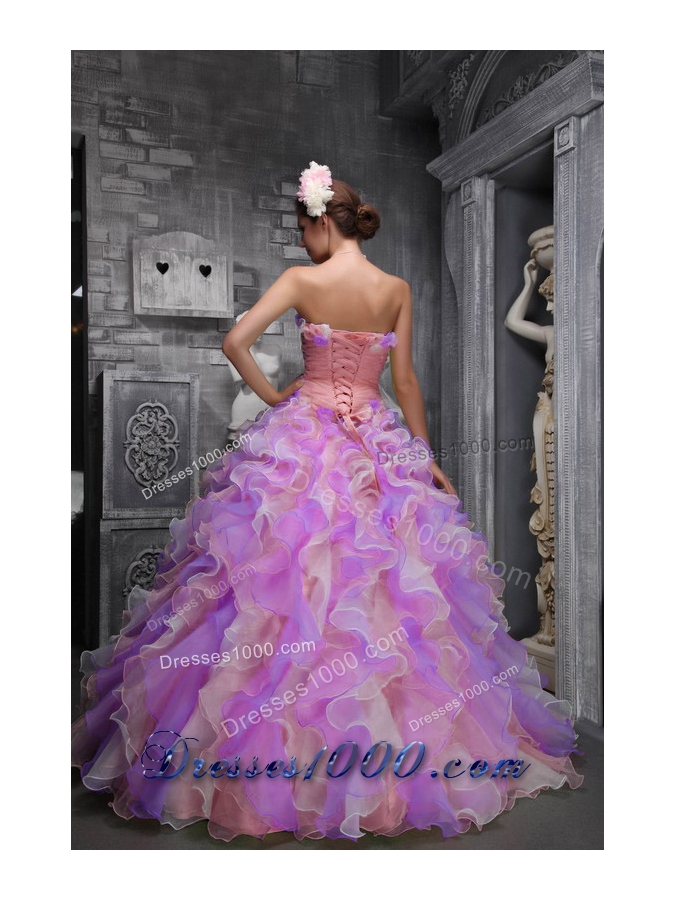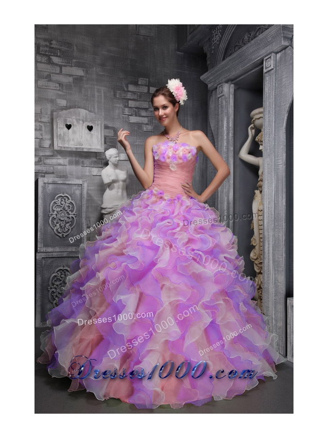 2014 Lovely Strapless Ruffles and Hand Made Flowers Multi-color Quinceanera Dresses