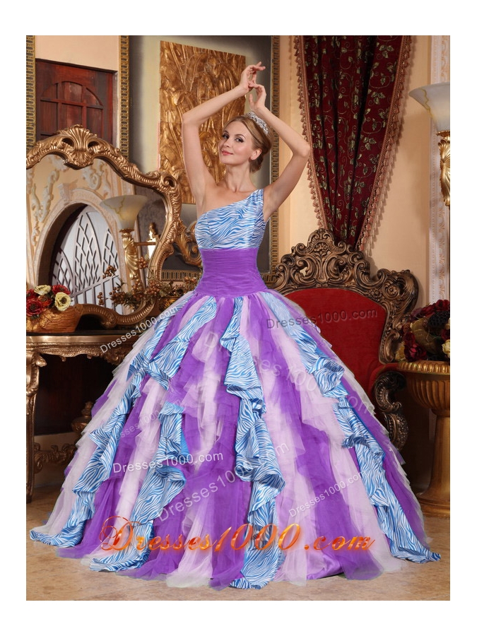 This quinceanera dress is fantastic. This dress with multiple color features a one shoulder bodice. The special design and zebra print add beauty and grace to the dress. The floor length skirt is adorned with ruffles throughout. You will make a grand entrance and a lasting impression by slipping into this exquisite ball gown.