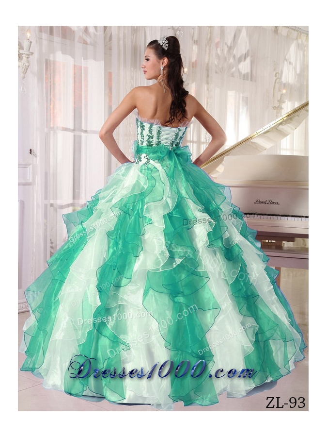 This perfect straight neckline ball gown quinceanera dress is featured with the contrasting colors of purple and white at the bottom of the dress, And the ruffles make the effect successfully.The bodice is decorated with purple appliques and tulle made waist band, which looks even falttering.