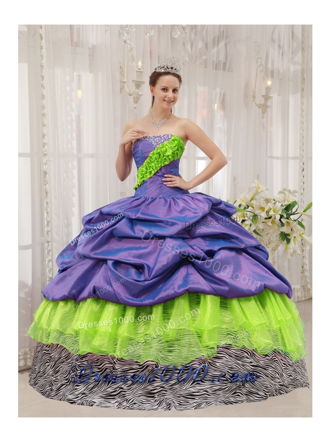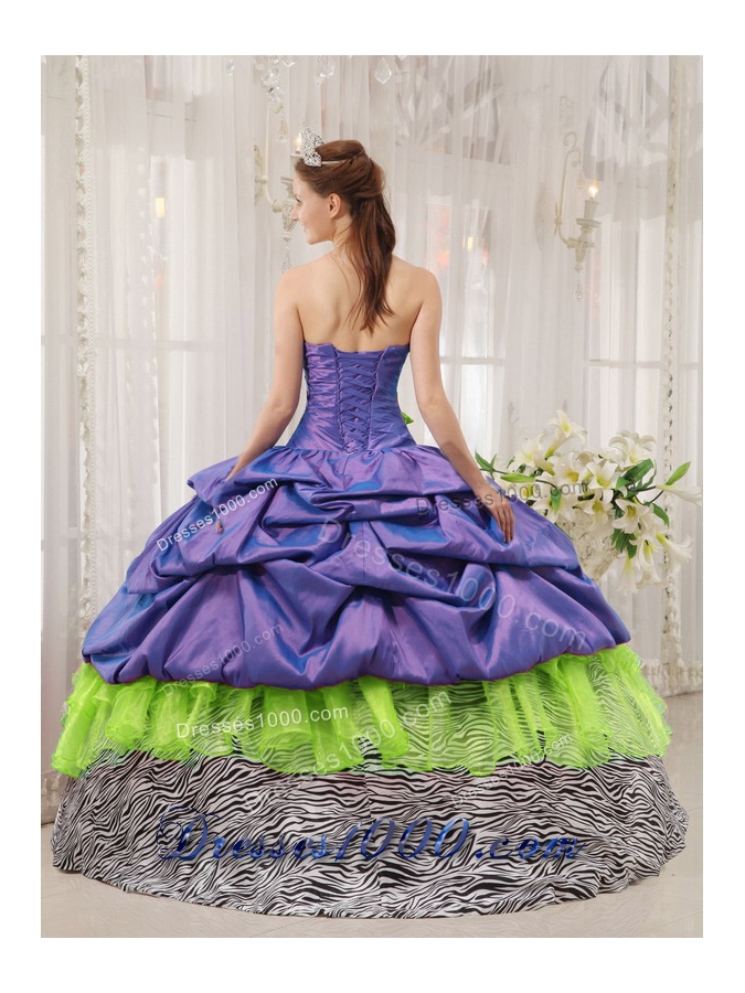 This quinceanera dress is abundant. The bodice features strapless neckline with rhinestone which adds luxury of the dress. The voluminous floor length skirt has been given depth with a pick up effect that creates soft, tiered ruffles down the gown. The zebra-stripe on the skirt make the dress more sexy.