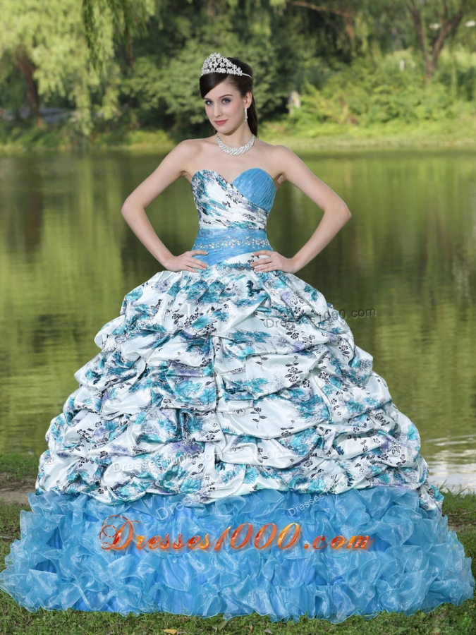 If you are looking for a chic and elegant design for your event, this one will definitely suffice. The gorgeous quinceanera dress features a strapless bodice which is decorated with clear ruching and a sweetheart neckline. The combine of colorful printing fabric and the blue tulle fabric form a sharp contrasting and also makes the dress more delicated. The skirt is fitted and it adorned with many pick ups, creating a lovely silhouette. Just a very flattering design for any body shape or style. Lace up back is fitted the gown.