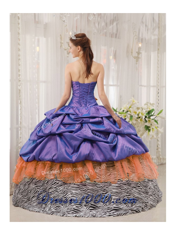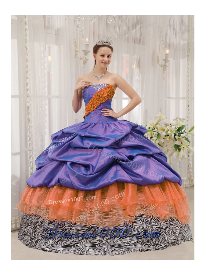 This quinceanera dress is abundant. The bodice features strapless neckline with rhinestone which adds luxury of the dress. The voluminous floor length skirt has been given depth with a pick up effect that creates soft, tiered ruffles down the gown. The zebra-stripe on the skirt make the dress more sexy.
