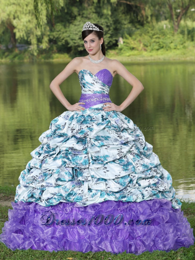 If you are looking for a chic and elegant design for your event, this one will definitely suffice. The gorgeous quinceanera dress features a strapless bodice which is decorated with clear ruching and a sweetheart neckline. The combine of colorful printing fabric and the blue tulle fabric form a sharp contrasting and also makes the dress more delicated. The skirt is fitted and it adorned with many pick ups, creating a lovely silhouette. Just a very flattering design for any body shape or style. Lace up back is fitted the gown.