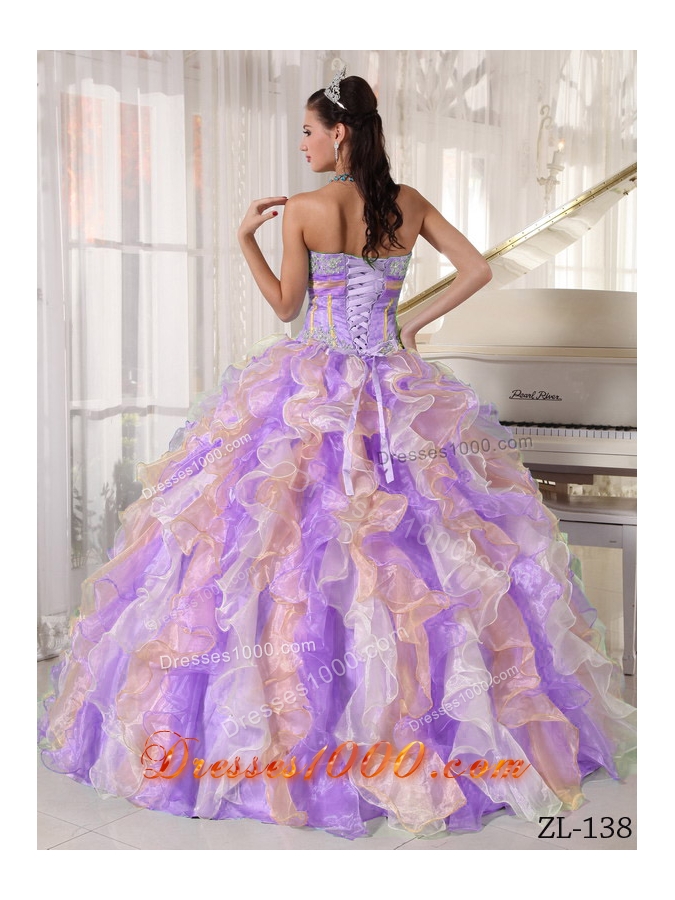 Do you want to experience the feeling of being the princess?This multi color quinceanera dress will make your dream come true.The fitted,strapless bodice with a sweetheart neckline features some exquisite beadwork, embellished appliques and also some ruchings.