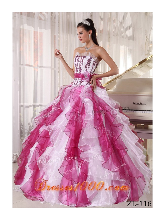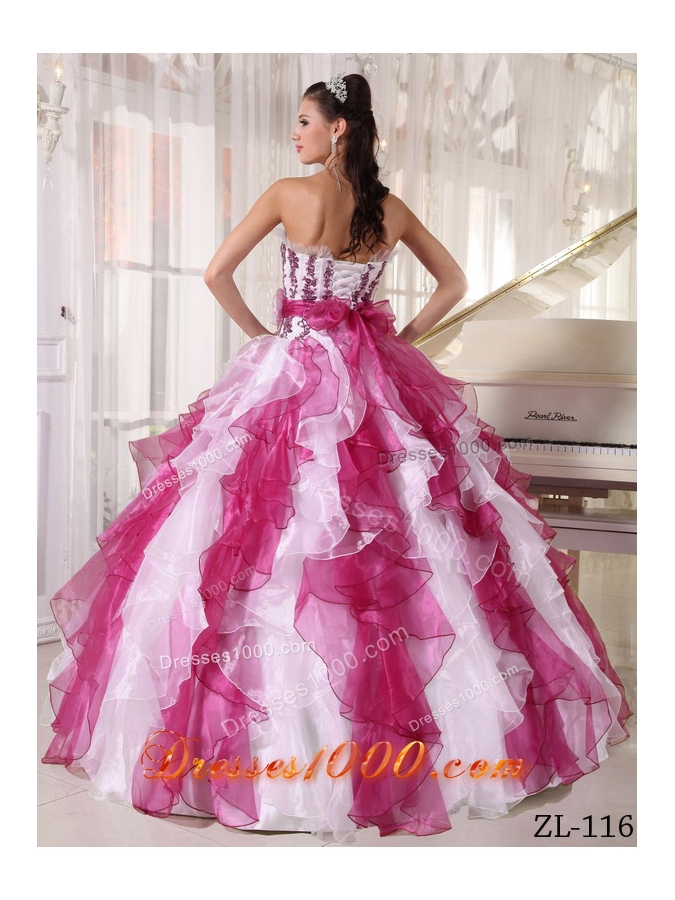 This perfect straight neckline ball gown quinceanera dress is featured with the contrasting colors of purple and white at the bottom of the dress, And the ruffles make the effect successfully.The bodice is decorated with purple appliques and tulle made waist band, which looks even falttering.