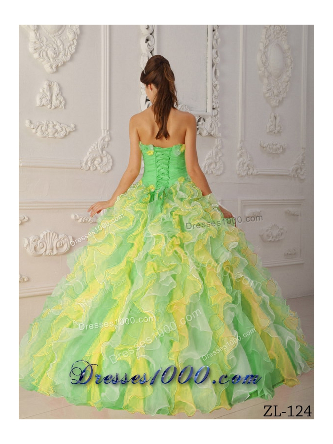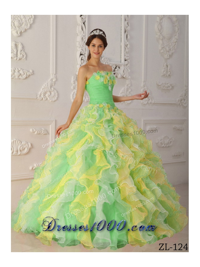 2014 Multi-Color Puffy Strapless Hand Made Flowers and Ruffles Quinceanera Dresses