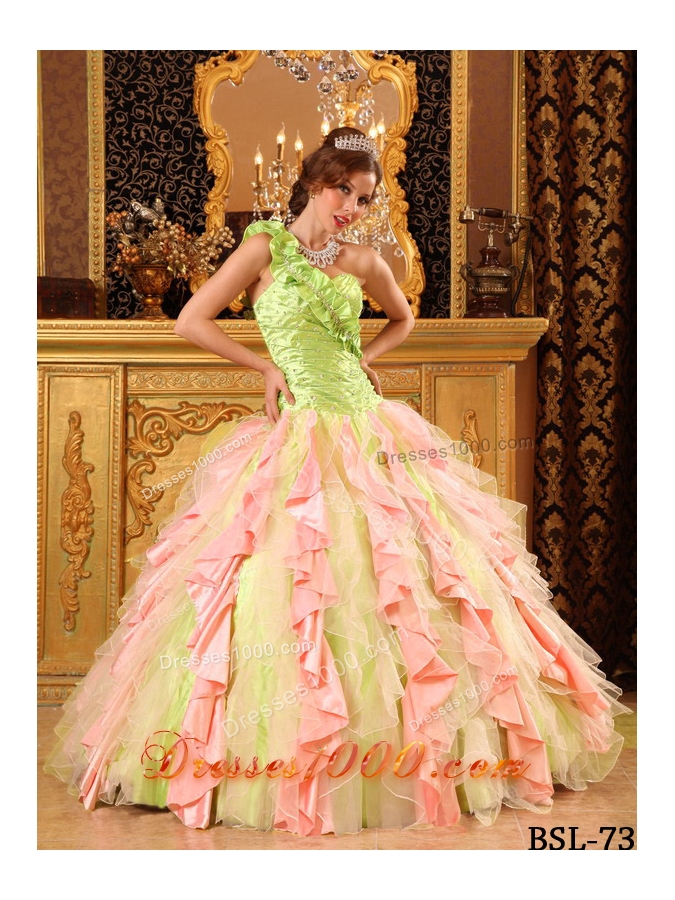 2014 Multi-Color Puffy One Shoulder Beading and Ruffles Quinceanera Dresses