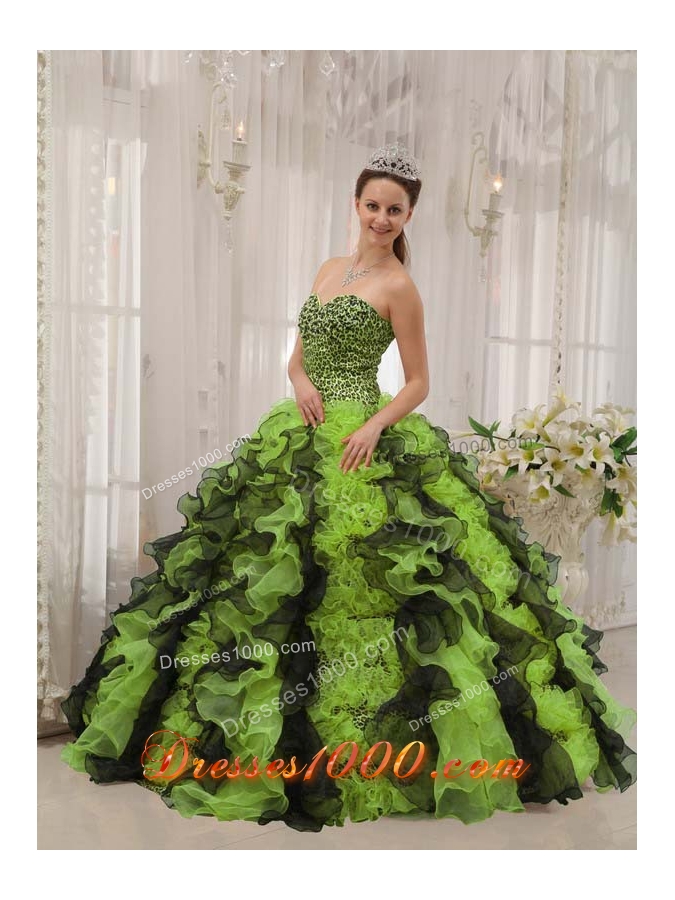 The pretty leopard quinceaera dress features a sweetheart neckline and a colored puffy skirt. The gorgeous skirt is made from many scraps of various colored scrapsand also lines of small tulle flowers, which add to its beauty, fullness and lovely shape. The lace up back finish the look. An amazing dress for those occasions when you really want to 'wow' the crowd.