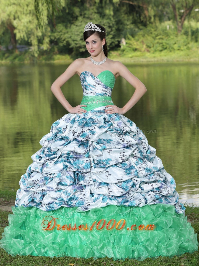 Colorful Printing and Organza Beading and Ruffles 2014 Quinceanera Dress