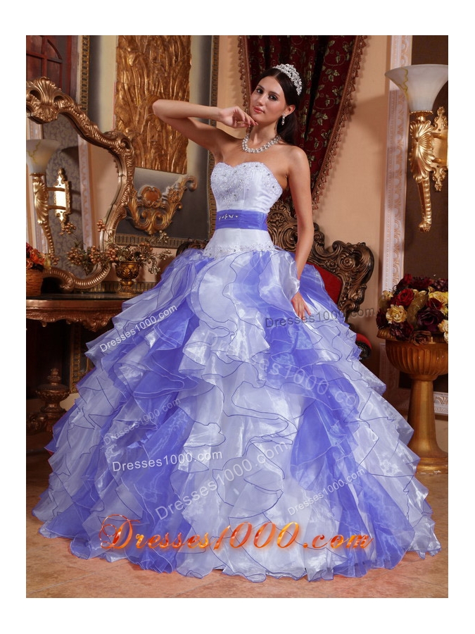 Get a celebrity look for less with this stunning quiceanera dress!The top bodice filled with dazzling beadings is made of a ruched waistband adorned with beadings. Flirty layers of organza ruffles start form the dropped waist to create a luxury skirt for this eye-catching dress for quiceanera or party.This is a beautiful gown and would make a lovely addition to anyone's formal wardrobe.
