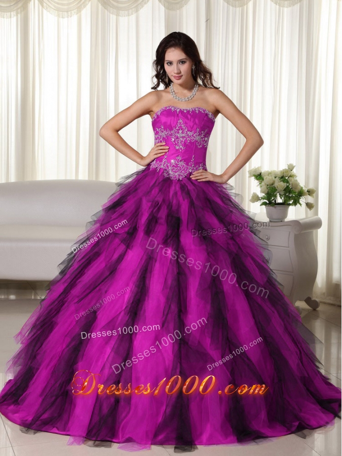 Sugar and spice! Are you looking for some special? This one is definitely the one you dreamed. The fitted bodice adorned with beautiful floral appliques helps to shape the bustline and waistline perfectly. The skirt is boasted by the amazing color: Fuchsia and black. Classical but special! The full skirt is riched in Fuchsia and black panels. The black accentst the whole spicy look! A lace up corset back ensures the perfect fit.
