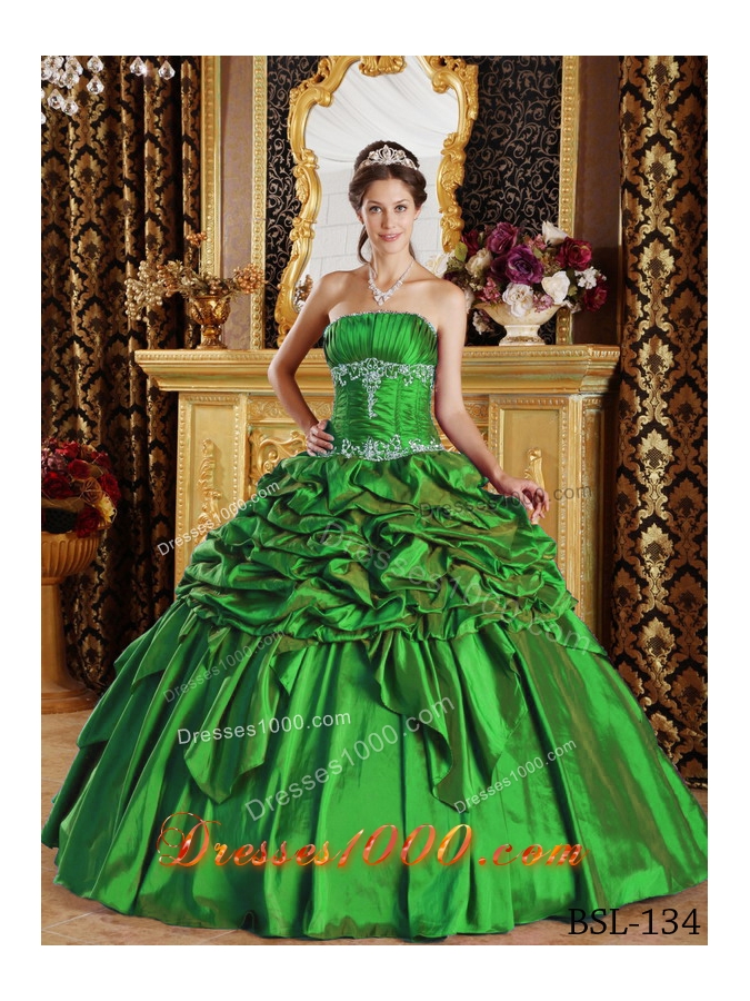 2014 Green Puffy Strapless Pick-ups Quinceanera Dress with Appliques