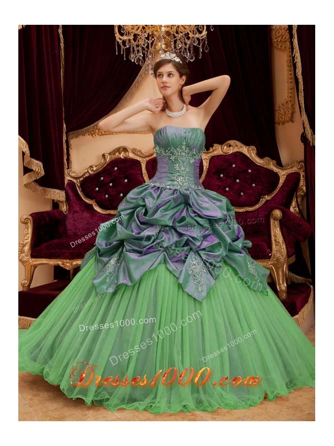 Perfect Green Puffy Strapless with Pick-ups and Beading for 2014 Quinceanera Dress