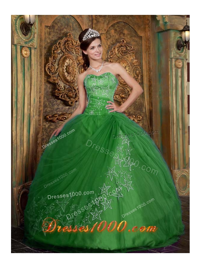 Exquisite Green Puffy Sweetheart with Beading and Appliques Tulle for 2014 Quinceanera Dress