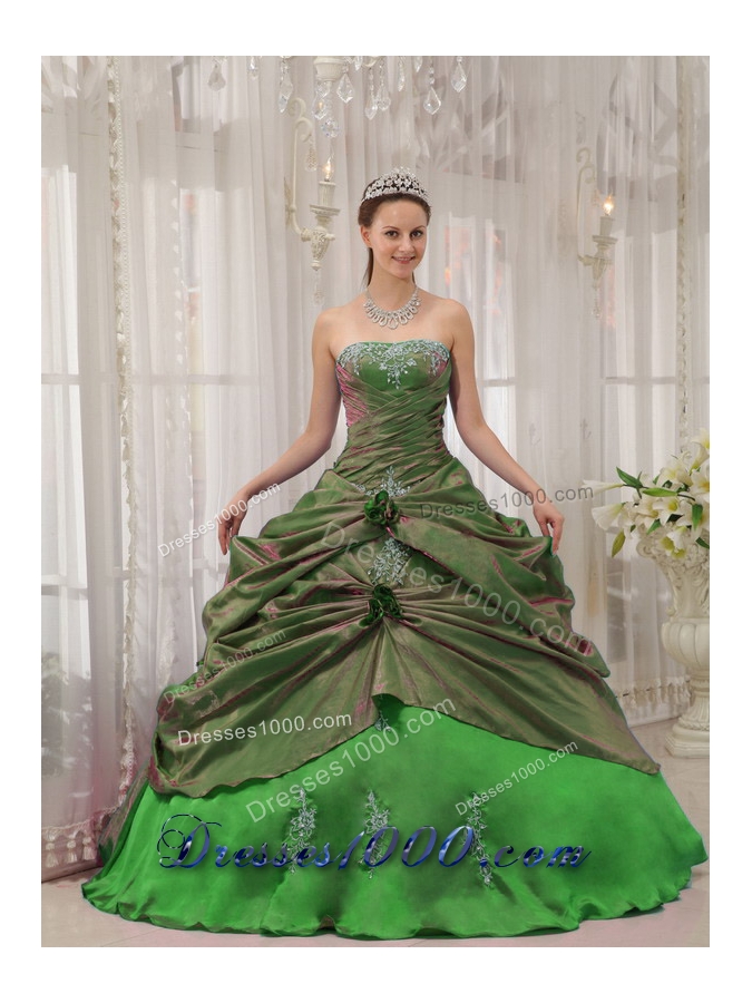 2014 Puffy Strapless Appliques with Pick-ups Decorate for Pretty Green Quinceanera Dress