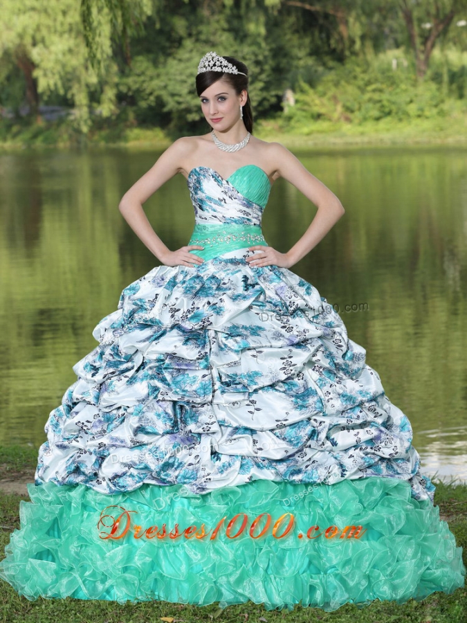 If you are looking for a chic and elegant design for your event, this one will definitely suffice. The gorgeous quinceanera dress features a strapless bodice which is decorated with clear ruching and a sweetheart neckline. The combine of colorful printing fabric and the blue tulle fabric form a sharp contrasting and also makes the dress more delicated. The skirt is fitted and it adorned with many pick ups, creating a lovely silhouette. Just a very flattering design for any body shape or style. Lace up back is fitted the gown.