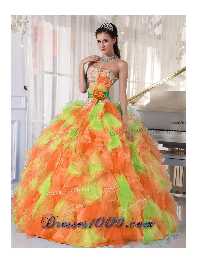 This gorgeous quinceanera ball gown features a fitted, strapless neckline accented with appliques in the bodice.The waist of this ruffled quinceanera dress was wrapped with ruched ribbons around waist which is decorated with a rosette flower.