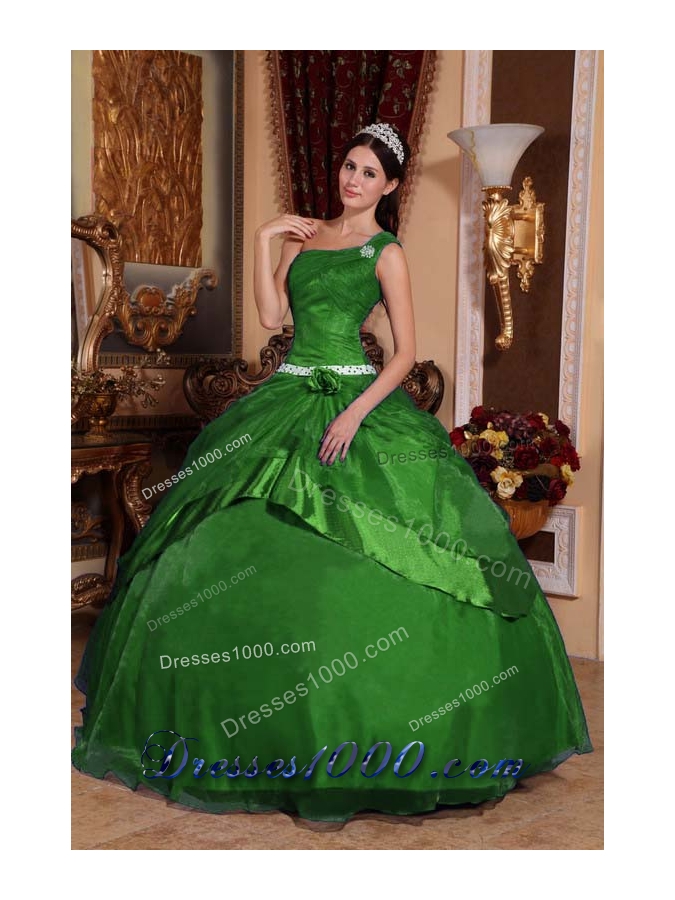 2014 Classical Puffy One Shoulder Green Quinceanera Dress with Hand Made Flower and Beading