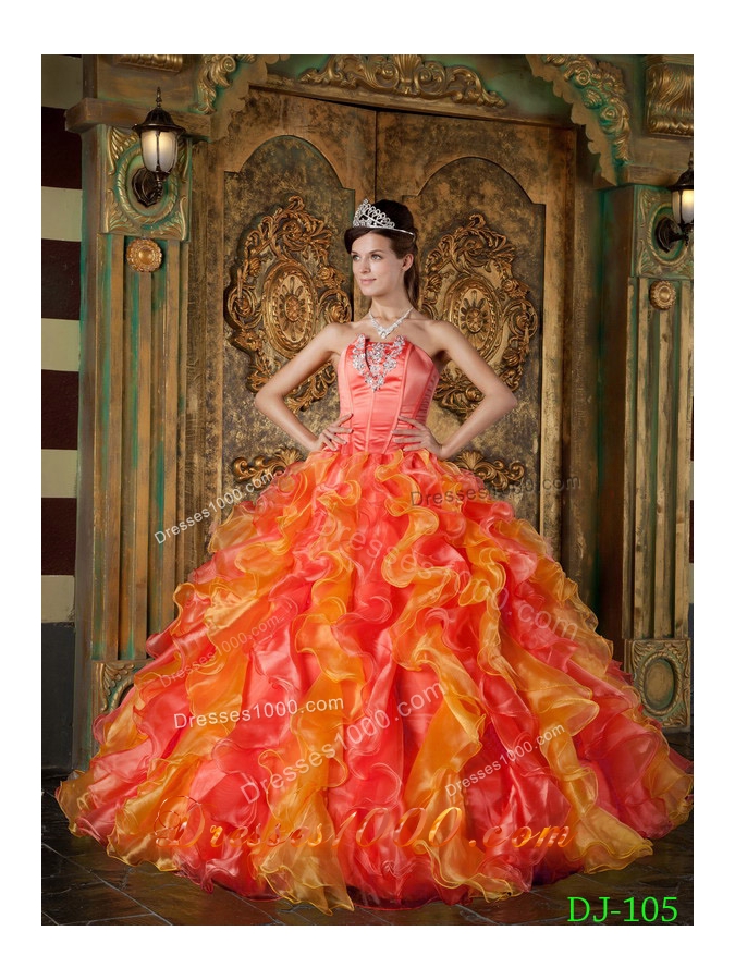 New Style Orange Red Puffy Strapless Ruffles Quinceanera Dresses for 2014